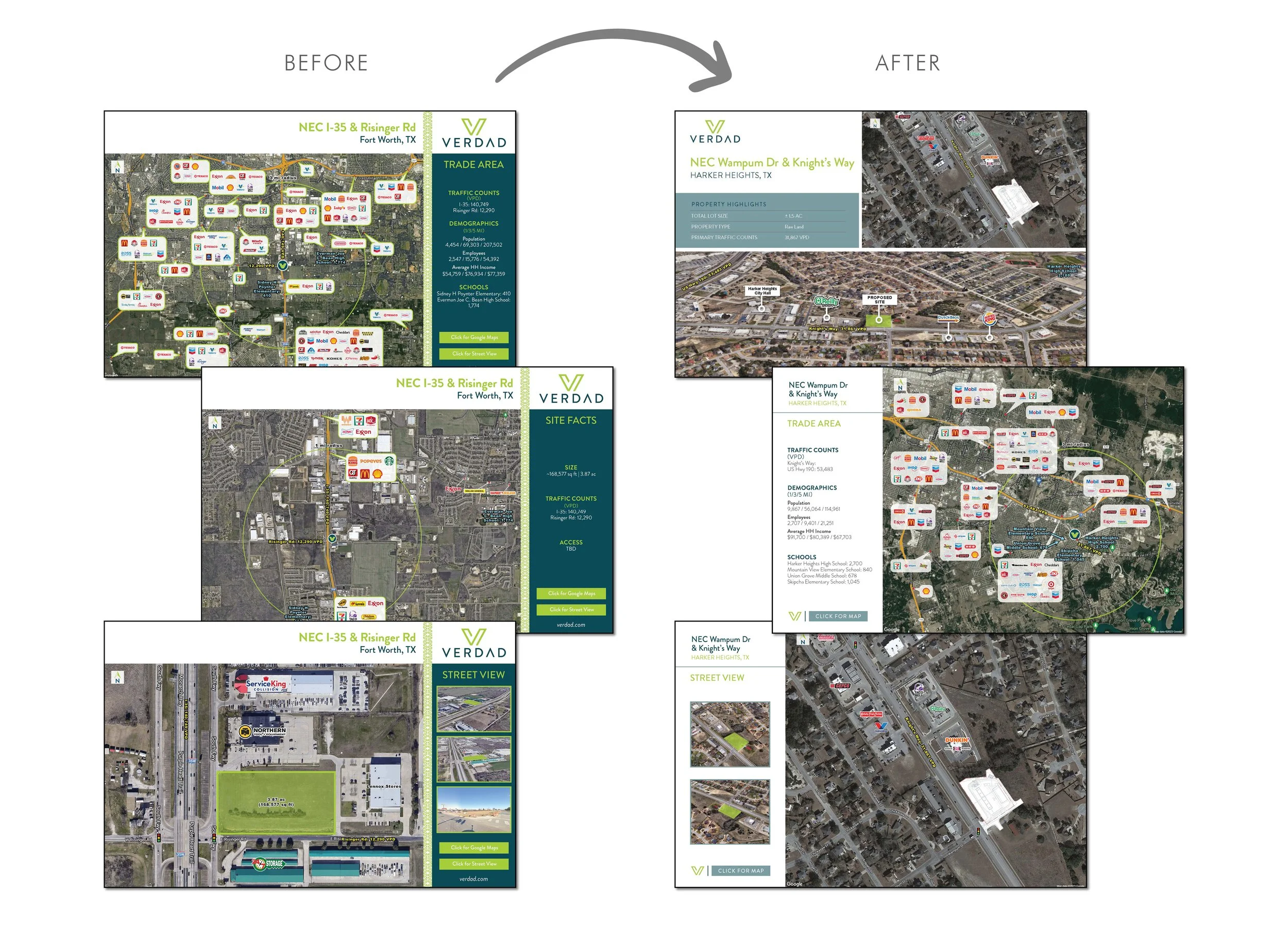 Upon joining Verdad, I was tasked with re-designing quite a few of their marketing materials. One large rebrand being the aerial package design. These aerials were used internally and externally to determine a site viability. With this new template, I created hundreds of these aerial packages all custom to the location and desired tenant.